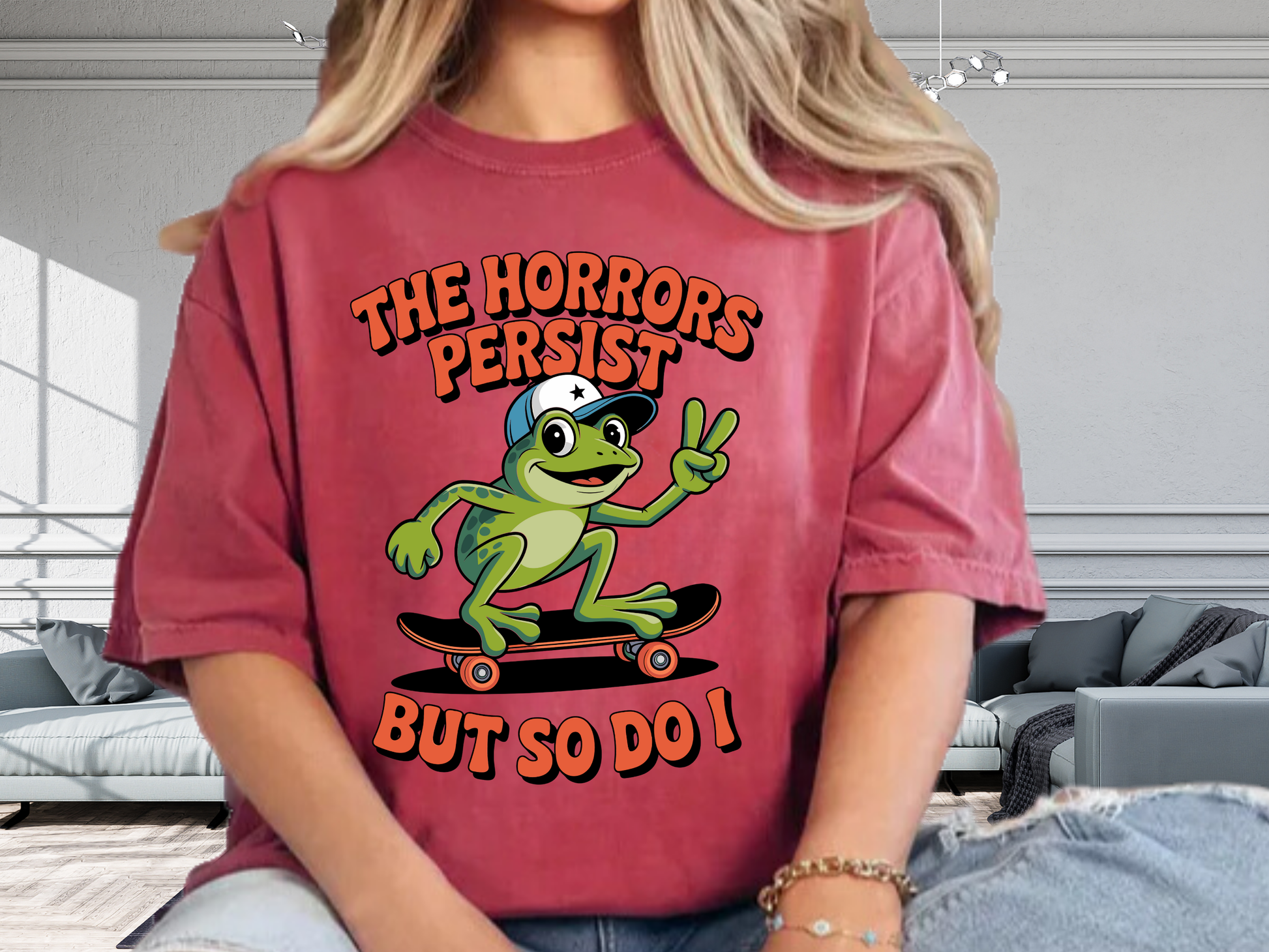Sometimes, the world is on fire, but you just have to grab your skateboard and keep moving. This hilarious "The Horrors Persist But So Do I" tee features a cool skater frog who remains unbothered by the existential dread surrounding him. It’s the perfect motivational shirt for the modern age.