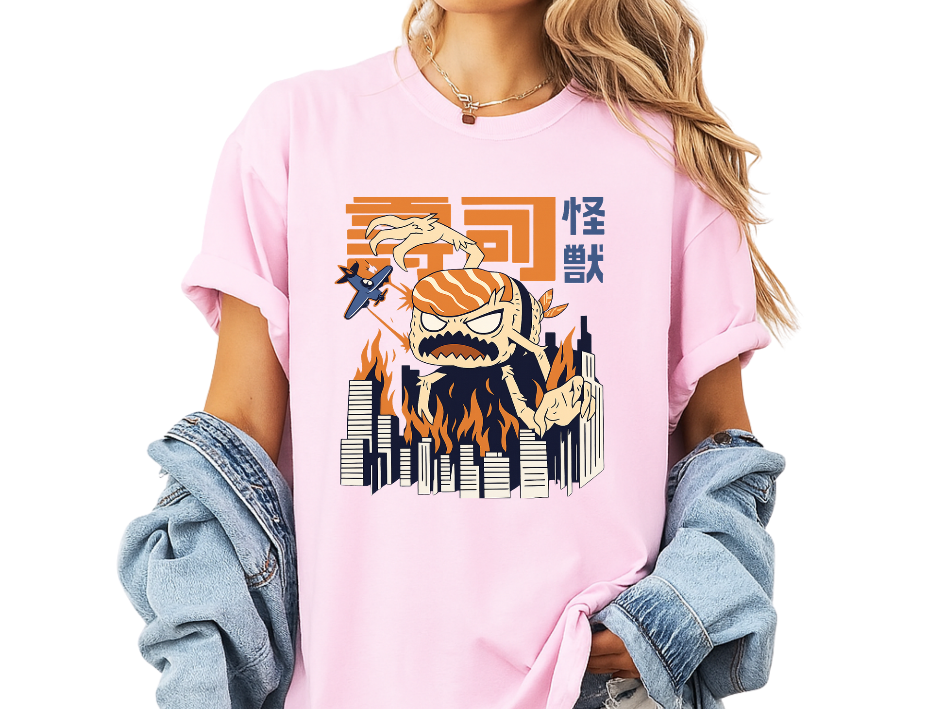Attack of the Giant Sushi Run for your lives (or your chopsticks)! The Sushi Kaiju Retro Japanese T-Shirt brings a hilarious twist to classic monster movies. Instead of a terrifying lizard, the city is being besieged by a giant, angry piece of Salmon Nigiri. Complete with fighter planes circling its head and flames engulfing the skyline, this design captures the chaos of a Kaiju attack with a delicious, foodie sense of humor.