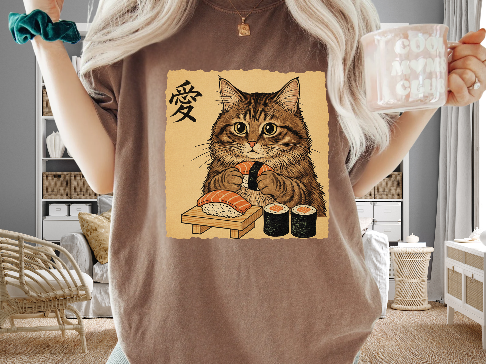 The Vibe is sophisticated yet playful. It is a must-have for anime fans, sushi lovers, and anyone who appreciates Asian art aesthetics. The warm beige and orange tones of the graphic stand out beautifully against the vintage dark grey fabric, creating a look that is both artistic and trendy. It is an excellent conversation starter for your next sushi dinner date.