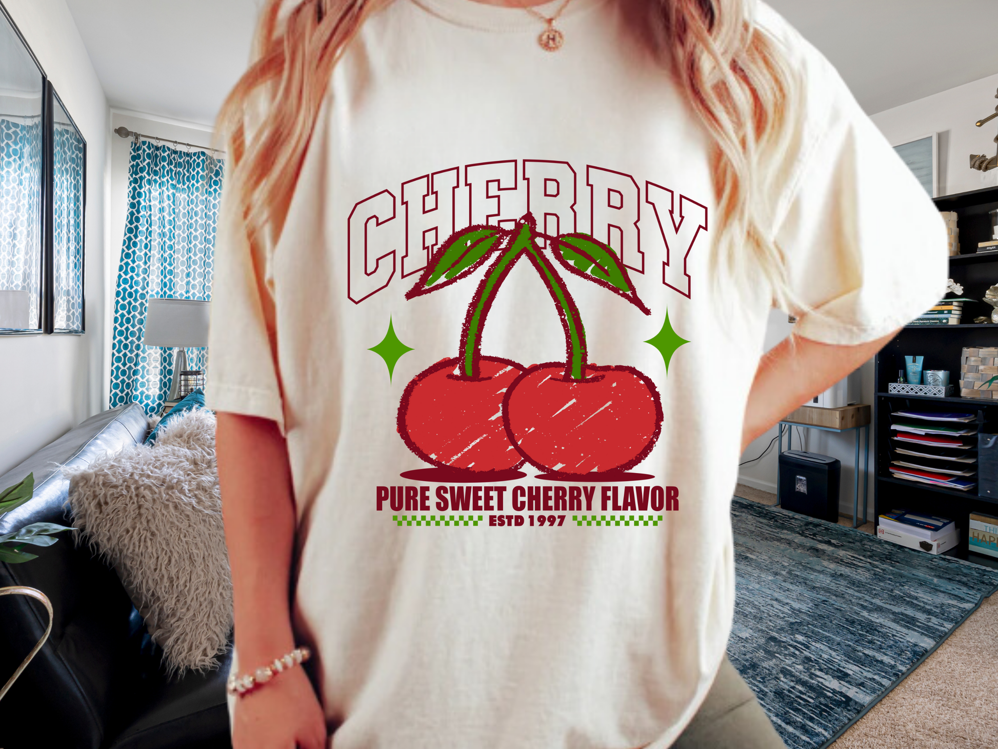 Add a pop of sweetness to your wardrobe with this Cherry Retro Tee. The design features a bold, vintage-inspired illustration of two bright red cherries with green stems, framed by sporty varsity lettering that reads CHERRY. Beneath the fruit, the slogan PURE SWEET CHERRY FLAVOR and the text ESTD 1997 add a nostalgic, 90s touch that feels like a classic fruit crate label. It is the perfect blend of summery freshness and old-school cool.