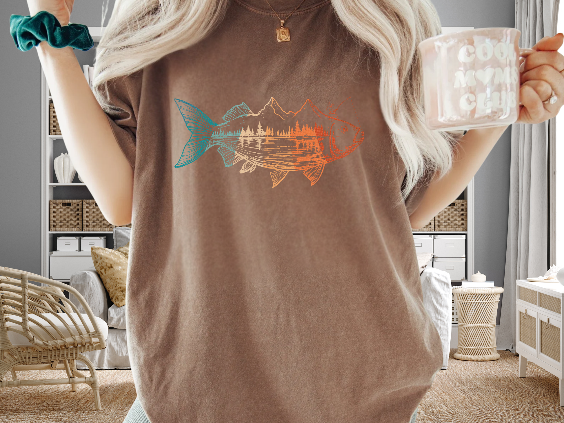 Fishing Mountain Double Exposure T-Shirt Trout Landscape Graphic Comfort Colors 1717 Outdoors Tee