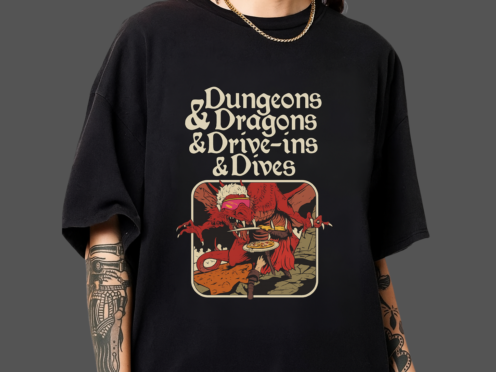 Roll for initiative and take a trip to Flavor Town with this hilarious Dungeons & Dragons & Drive-ins & Dives Tee. This brilliant mashup design features a classic fantasy red dragon reimagined as the Mayor of Flavor Town himself, complete with spiky frosted tips, cool sunglasses, and a delicious pizza in hand. The vintage cream typography mimics the classic ampersand style while spelling out the ultimate crossover between tabletop gaming and iconic food television.