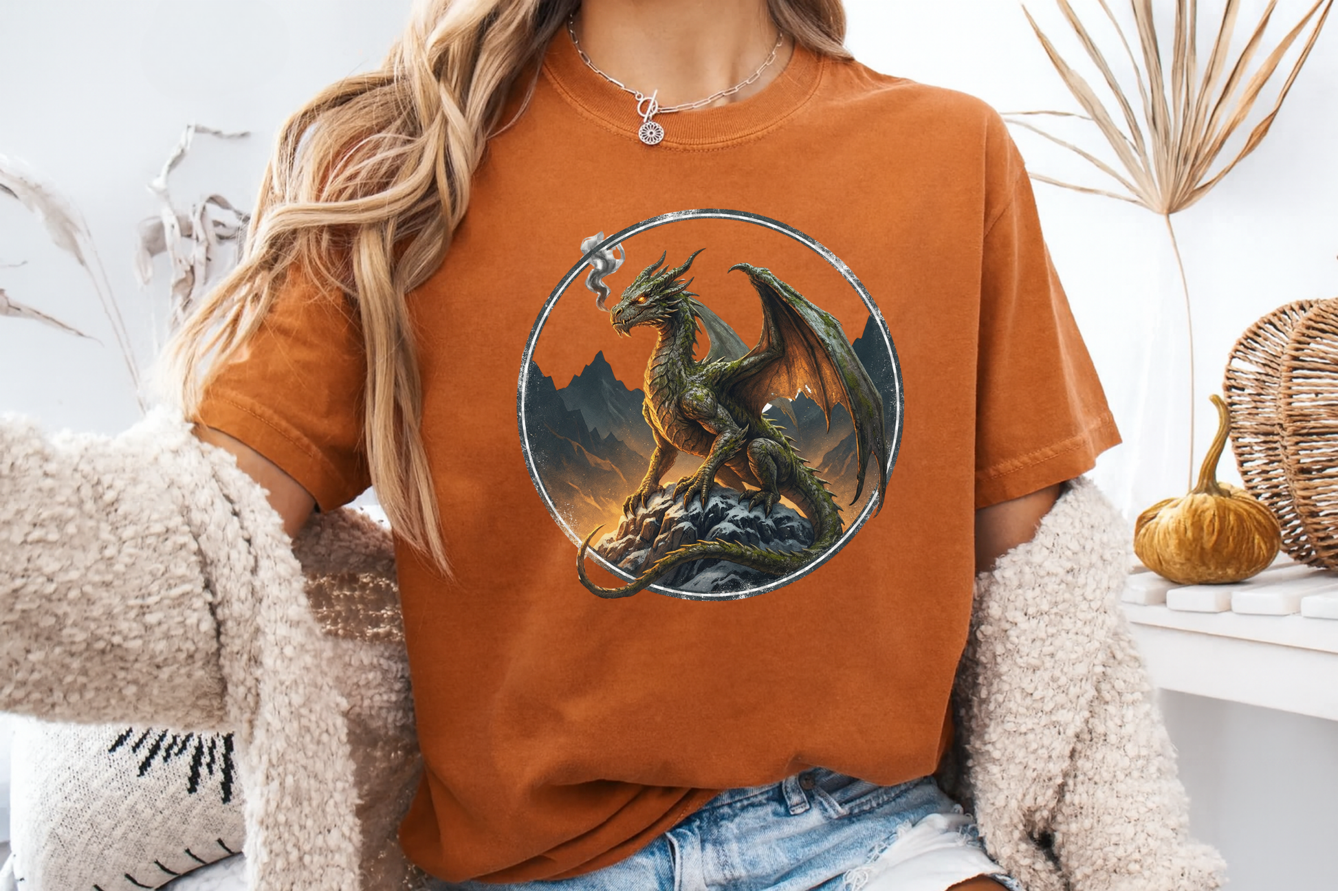 Stunning Realistic Fantasy Art The design features a breathtaking illustration of a formidable green dragon perched atop a jagged mountain peak. Bathed in the warm glow of a setting sun, the dragon breathes a wisp of smoke, looking out over its domain. The artwork is framed within a stylish circular border, giving it a clean, badge-like aesthetic that looks sophisticated on the vintage "Pepper" dark grey fabric. The intricate details of the scales and wings bring this legendary beast to life, setting it apart from standard cartoonish designs.